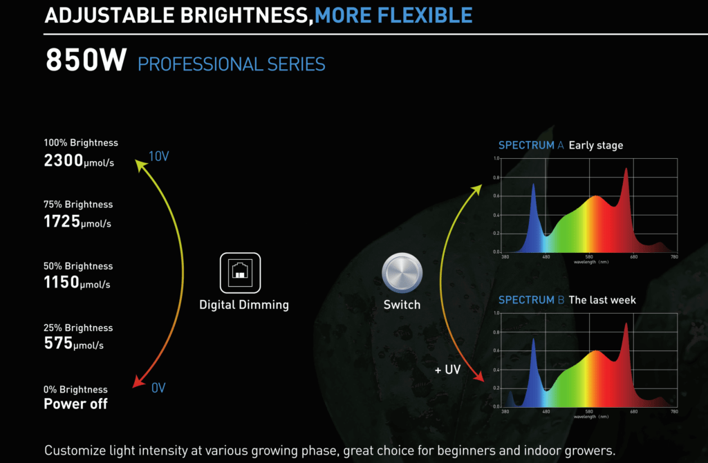 A full-spectrum LED grow light is just a marketing word that means the grow light closely resembles sunlight. This marketing term is derived from the idea of “full-spectrum illumination,” which has been applied to electromagnetic radiation spanning the UV to infrared wavebands in recent years